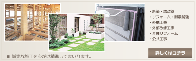 工事着工までの打ち合わせから、プランニングまでお客様のこだわりや要望の声を聞き、納得いただけるように、親切、丁寧に工事を行ってまいります。引き渡しが終わってからが本当のお付き合いだと考えています。小さい仕事は頼みづらいとお考えの方もいらっしゃいますが、お困りのことはどんどんお申し付け下さい。これからも、弊社に頼んで良かったと言って頂けるよう、誠実な施工を心がけ精進してまいります。